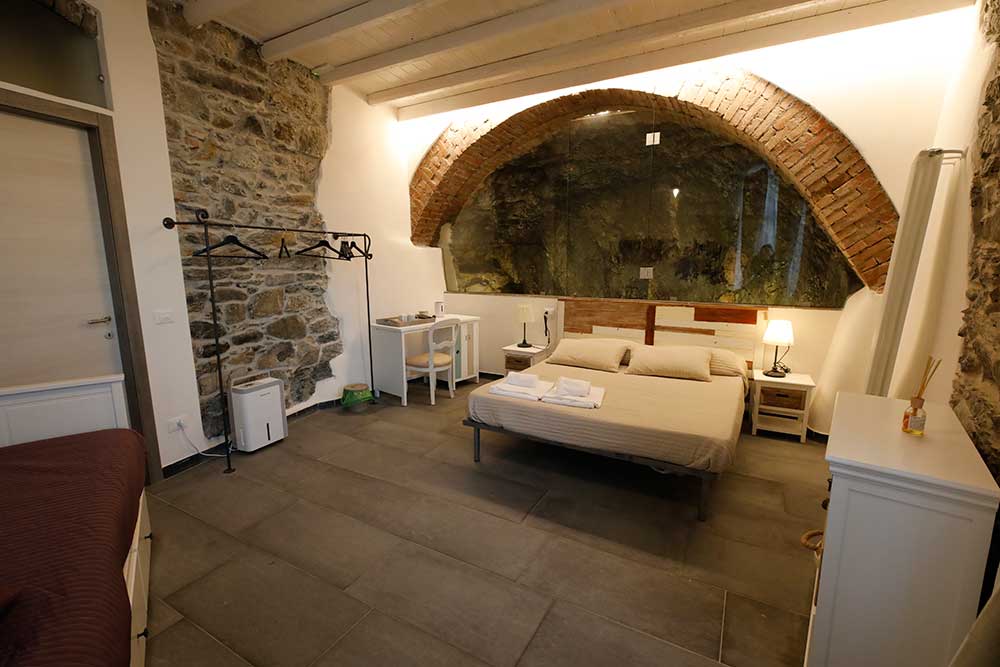 The original stone of the foundations of this building, dating back to 1897, appears at times on the side walls. Another particular feature of this room is the bright glass wall open on the main square of Manarola, from which you can see and appreciate the art work of the famous painter and sculptor Silvio Benedetto and a small view of the sea.