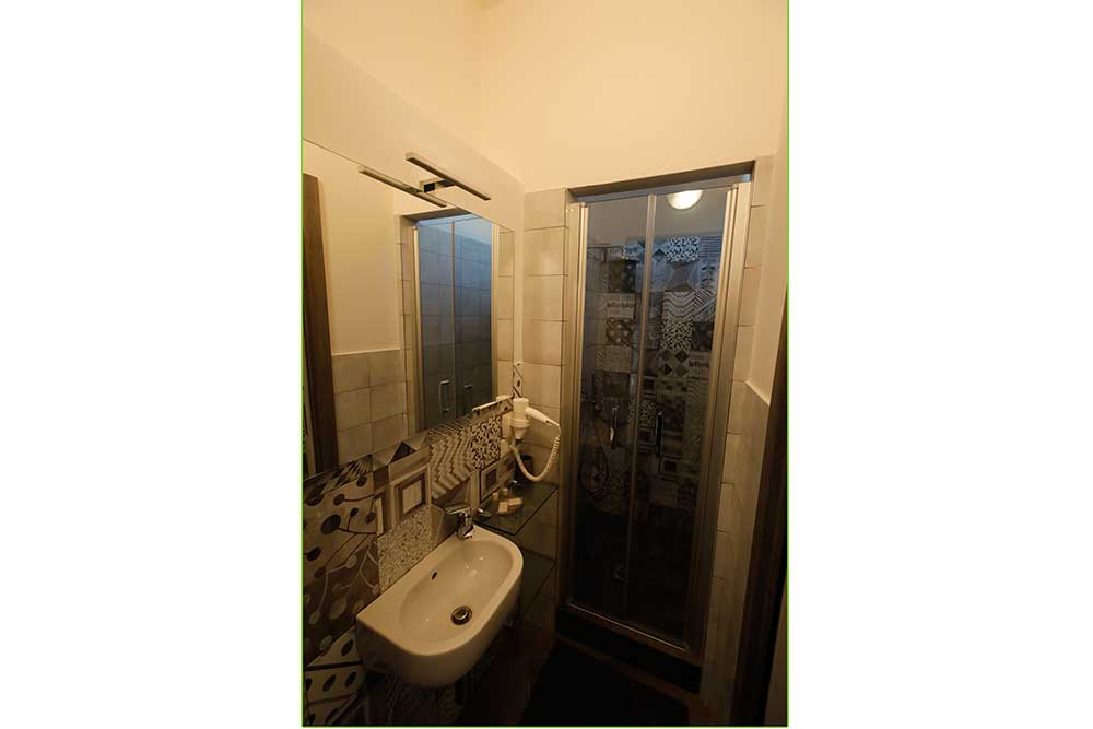 The room is provided with a comfortable bathroom and ante-bathroom, in grey shades, with crystal shower box, and with WC and bidet in a separate toilet. The room and the bathroom are provided with main comforts: air conditioning unit with muffler, mini-fridge bar and hairdryer. Furthermore, our guests can have infusions, tea and coffee autonomously, both in the room and in the little hall dug in the stone, in the lower floor next to the reception, embellished by a full length wall seventeenth-century world map.