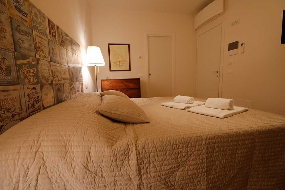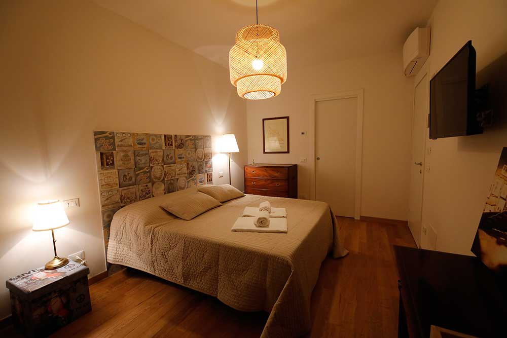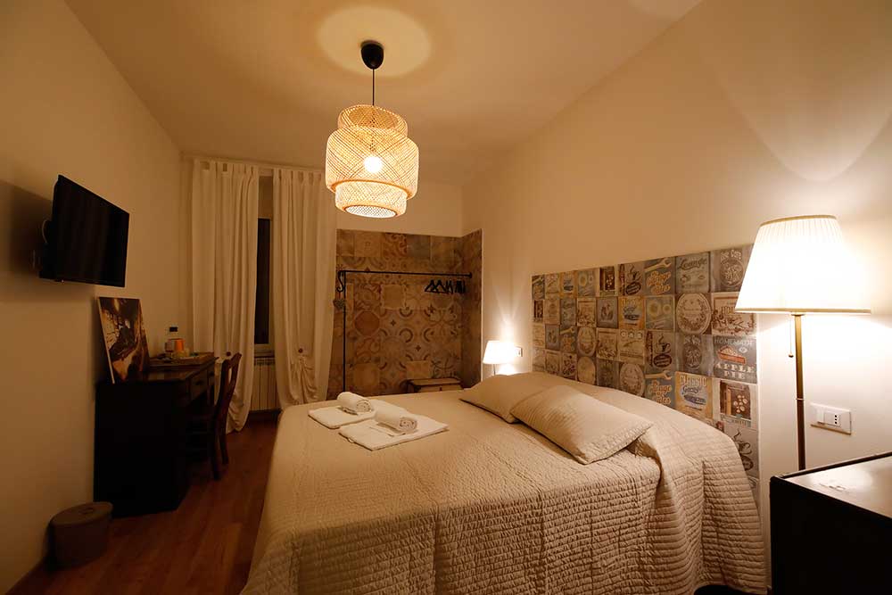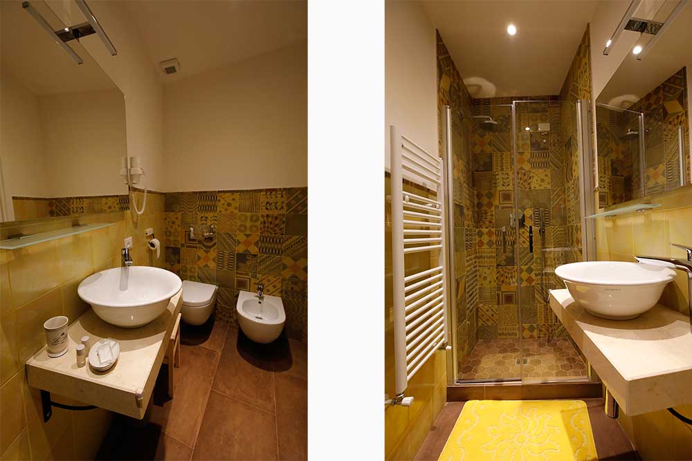 Double room with warm colors shades furnished in “vintage” style and embellished by Nineteenth-century cherry wood writing desk and chest of four drawers. Both pieces of furniture have been owned by Rollandi’s family for almost one century and were originally on board of the English clipper “Great Eastern” carrying tea from India to England. The room is also characterized by the wrought iron coat stand and the bedhead made with “old fifties” tiles. The room has a comfortable bathroom in yellow shades, with crystal shower box and washbasin on a natural stone shelf. The room and the bathroom are provided with main comforts: air conditioning unit with muffler, mini-fridge bar, safe and hairdryer. Furthermore, our guests can have infusions, tea and coffee autonomously, both in the room and in the little hall dug in the stone, in the lower floor next to the reception, embellished by a full length wall seventeenth-century world map. Our guests can also make use of a wide terrace with a fine view on the sea. Here they can have breakfast or just relax in the open air.