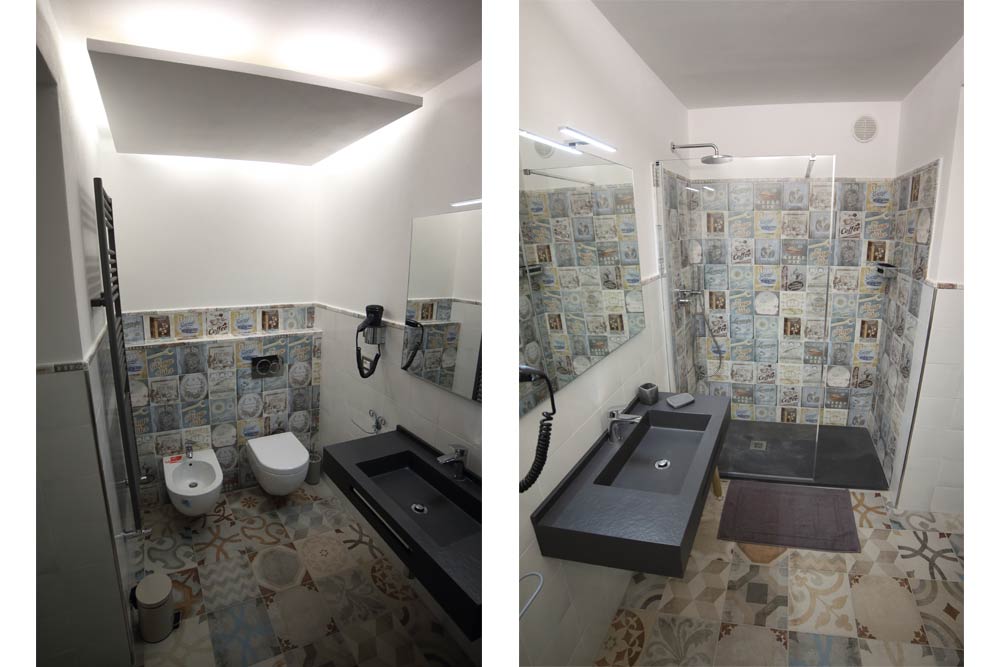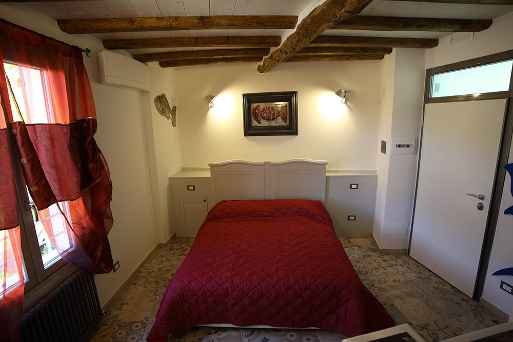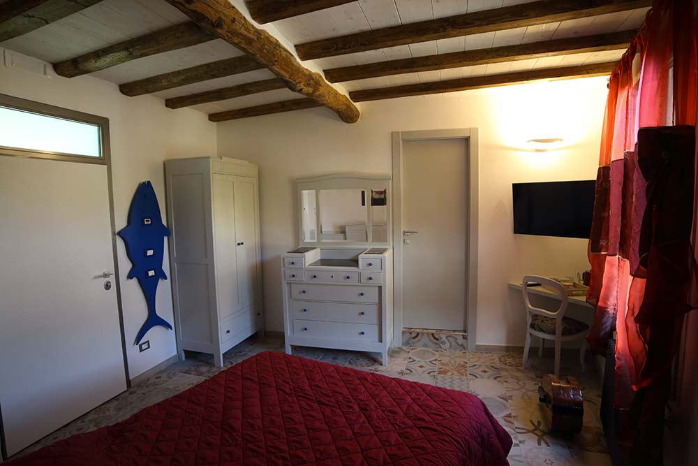 You will enter the room no. 4 directly from the outside. This room used to be the family kitchen changed into a guest area for you, people traveling around the world eager to discover our land. The floor reminds the floors of old farmer houses typical of these areas. The wide bathroom will take you back to the magic of 50’s and will show you some icons of the past. The old and restored furniture evokes the traditions of Edoardo’s family origins: farmers and oil and wine producers. In each room and bathroom you can admire some paintings and works by local artists and Edoardo, made with waste material. They represent the passion - both Lorenzo’ and Edoardo’s one - for the sea and for great pelagic fishes such as tunas and swordfishes! For this reason, you find in each room a big blue pelagic fish shedding energy. On the desk you can find sweeties and beverages to welcome you warmly. In each room there are a fridge, a safe and a LCD tv. Behind the local art there’s a secret that only our guests can discover!